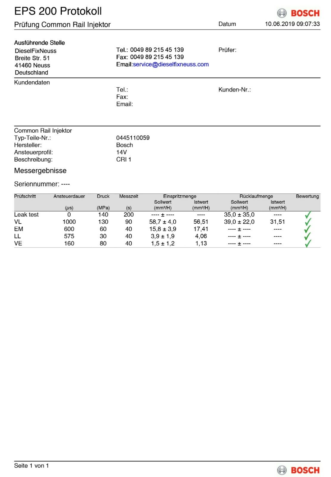 1 x injecteur AT avec bague d'étanchéité en cuivre + rapport de test BOSCH
