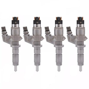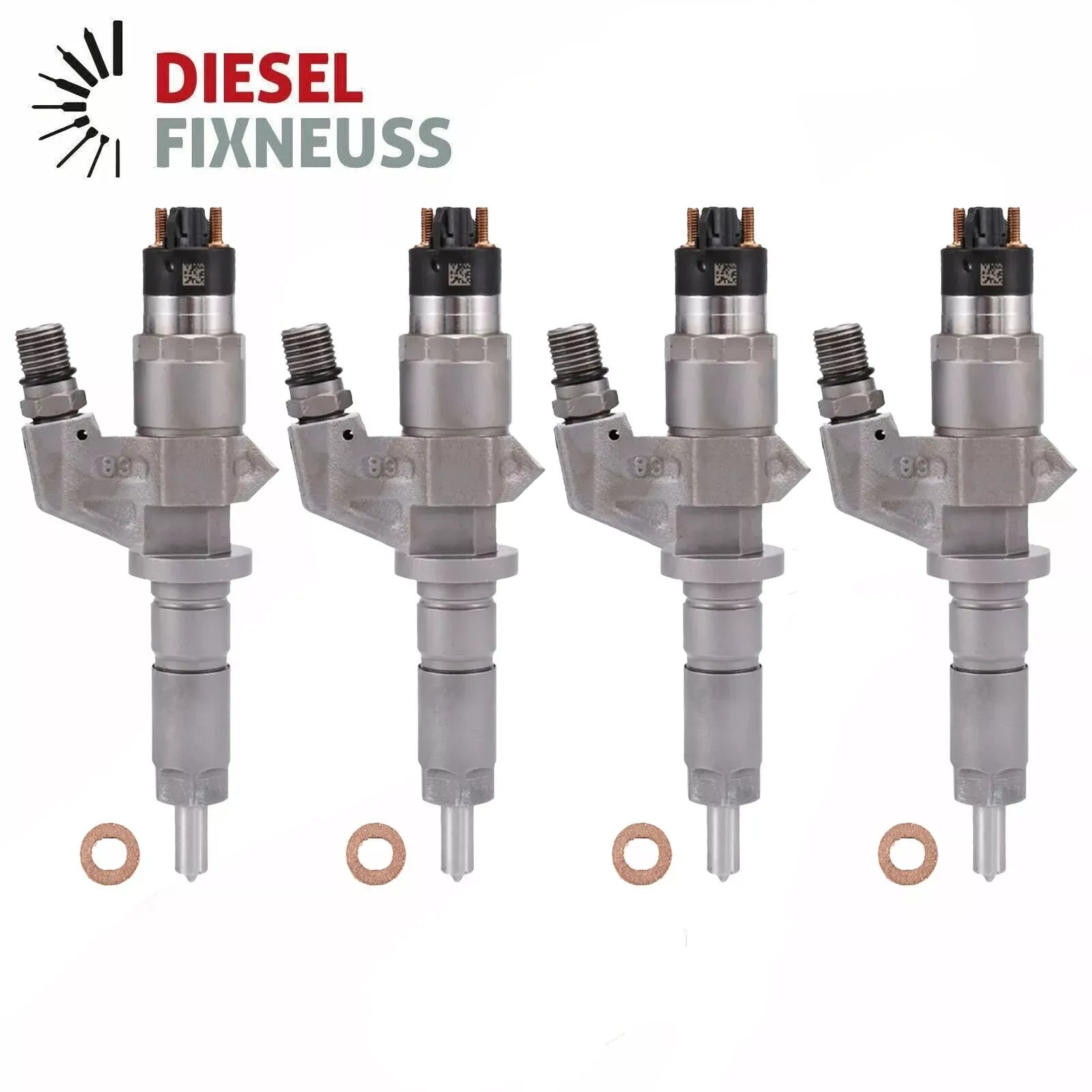 4x BOSCH injector 0445120008 for GMC ISUZU CHEVROLET 6.6L diesel engines. Compatible with LBZ engine codes. OEM quality replacement part.